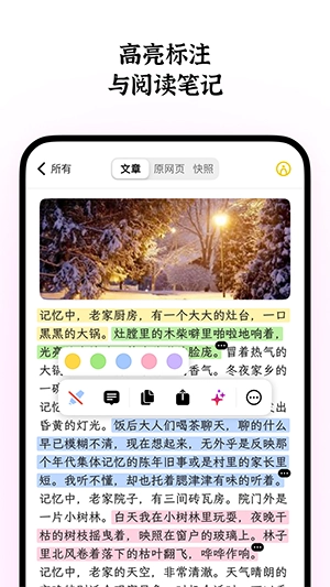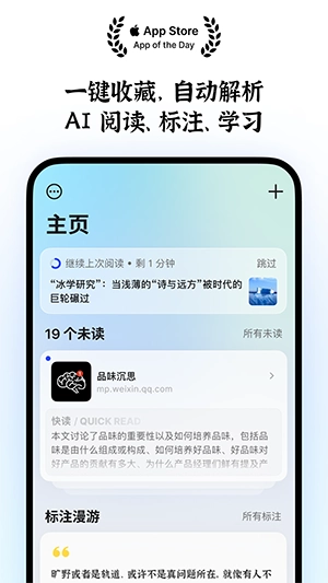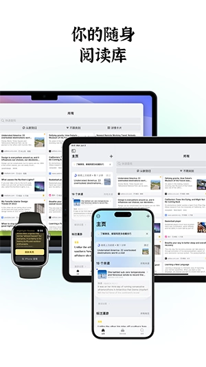 运用自定义的字体、样式及主题阅读文章,始终保持专注状态。对文章里的精彩部分进行标注,记录下你阅读时的思考。借助链接或图片,向好友分享你的所见所闻以及独到见解。利用桌面回顾、阅读推荐小组件,养成良好的阅读习惯,让信息切实为你所用,一切尽在掌控之中。