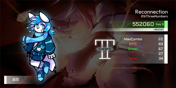 7、当歌曲结束时,游戏也随之结束,此时玩家能够查看自己的分数。另外,在游戏里还有诸多玩法,等待着玩家们自行下载去体验。
