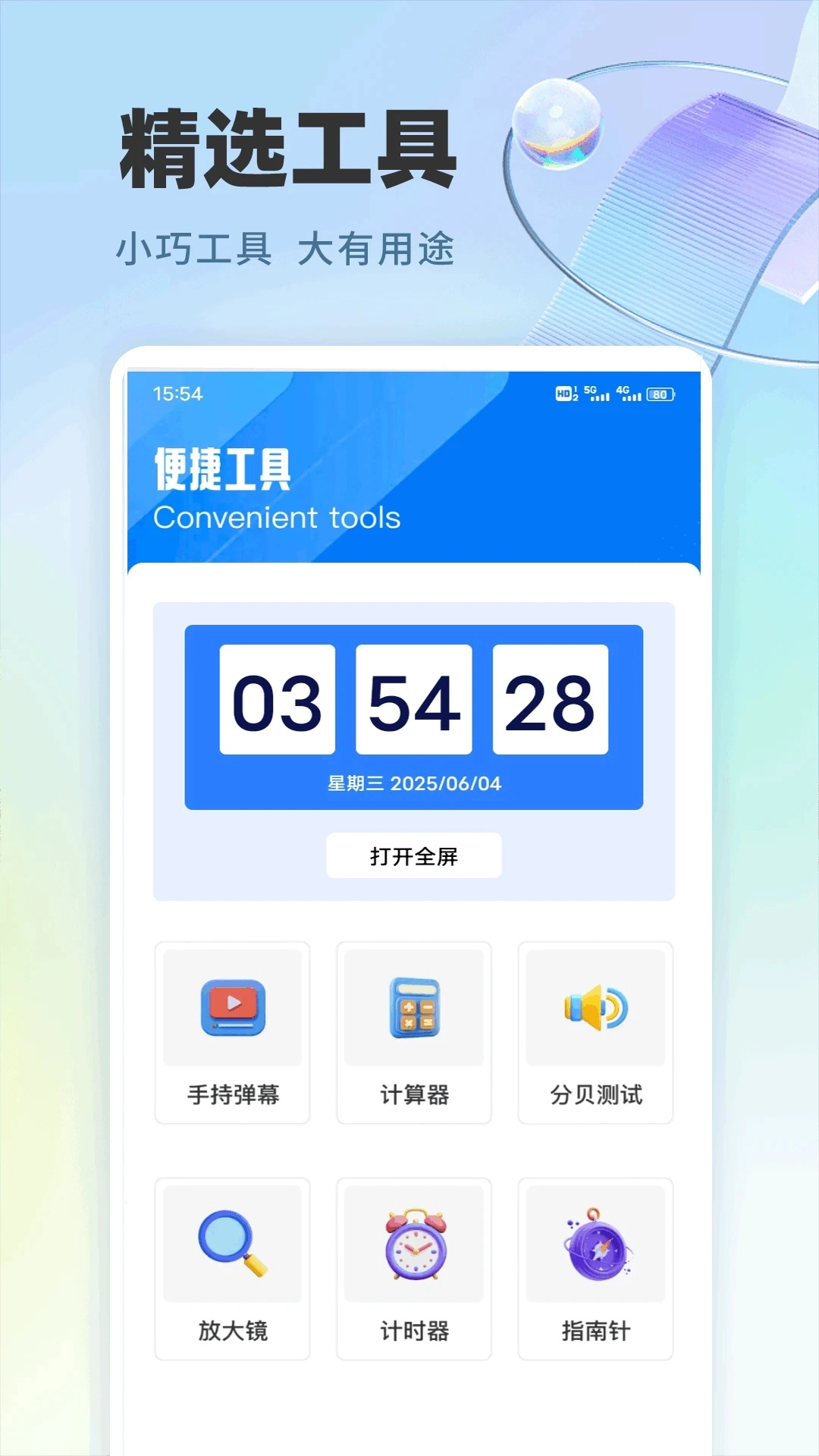 提供手持弹幕、计算器、分贝测试、放大镜等工具。