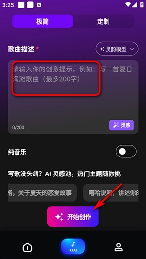 1、点击中间的创作按钮,输入音乐的关键词点开始创作。
