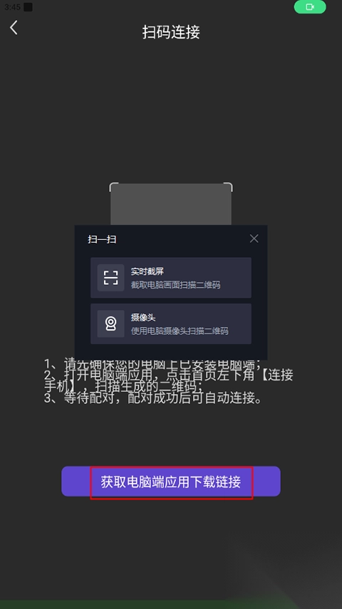 3、若电脑端安装了app,可点击电脑首页左下角的“连接手机”选项,此时会生成一个连接二维码。使用手机扫描该二维码,配对成功后即表示连接成功。