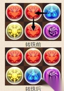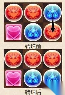 5、当三颗同色的珠子呈现出图示中的形态时,选中中间那颗水珠,依照图示箭头所指方向旋转,如此一来,三颗火珠就能达成可消除的排列状态啦~
