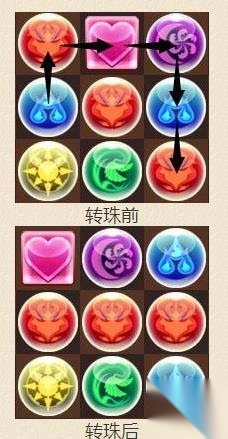3、若同色珠子三颗呈斜向摆放,选取靠近火珠的任意一颗珠子,按顺时针或逆时针方向旋转大半圈即可。此次我挑选的是火珠下方的一颗水珠,从最短路程考虑,应选择顺时针旋转,转到右下角,这样三颗斜排的火珠就能达成三连消除。需留意的是,要依据自身需求与整体布局,挑选适合自己的起始珠子。