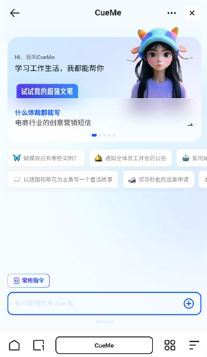 CueMe 预设了多个常用指令,旨在简化用户操作流程,实现定制化内容的快速生成。例如,“帮我润色作文”或“为文章谋篇布局”等指令。