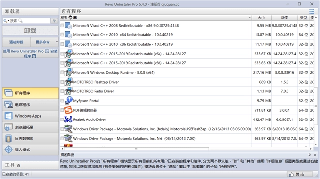 Revo Uninstaller中文版是一款专业的软件卸载与系统清理工具。这款Revo卸载器的软件卸载功能涵盖:猎人模式、安装追踪程序、强制卸载扫描分析、启动项管理器、垃圾文件清理、使用痕迹清理以及浏览器扩展管理等。