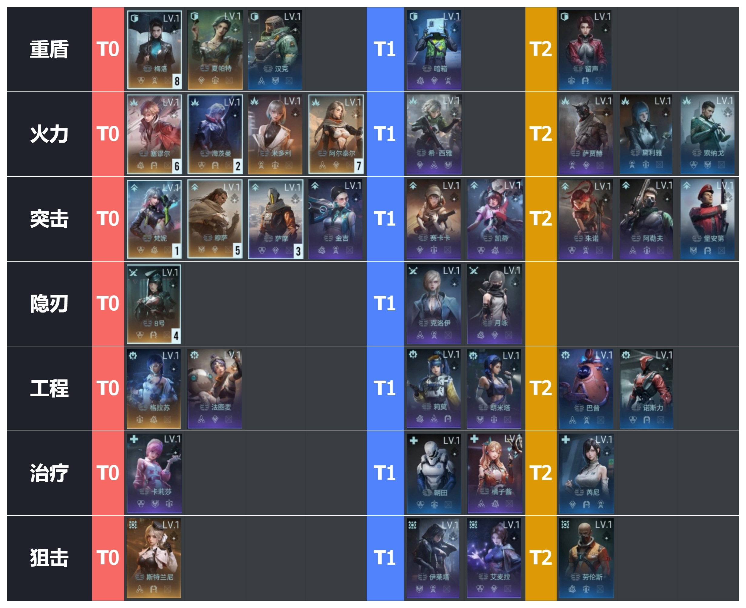 初级阵容推荐(升级版):西雅、赛卡卡、汉克、暗箱、伊莱塔、卡莉莎、克洛伊,最后一个位置同上