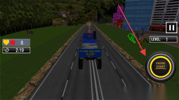 3、于公路场景之中,点击【ENGINE START】启动卡车,依照关卡要求,负责运输马匹,同时要避开各类障碍,进而完成任务。