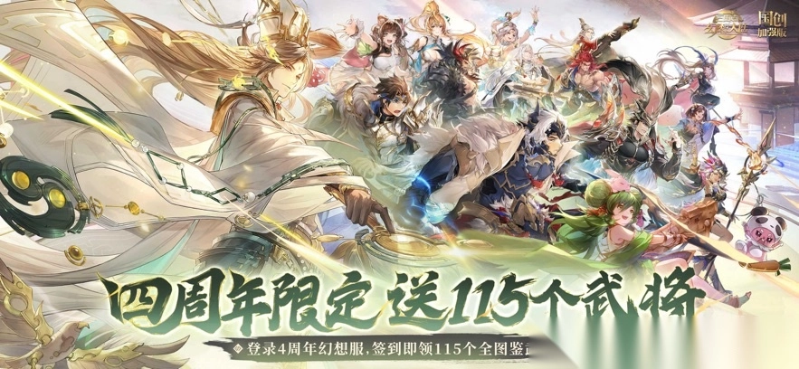 3. 【限定福利】登录4周年庆幻想服&返利服,通过「卧龙百将录」活动,签到即可领取115个全图鉴武将,和海量养成资源。通过「守望相助」活动,最高拿满5红曹丕命魂信物!