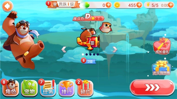 2、在游戏主页面中有角色、宠物、任务、碎片等工具栏,玩家可切换角色、升级、查看日常任务、排行等。