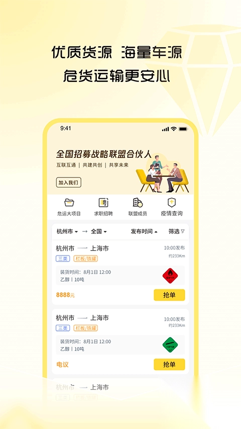 危司机app是一款专门为危运行业量身定制的接单软件。它借助互联网、AI算法、大数据等先进技术,依托云SAAS系统,让运输公司管理变得更为轻松,盈利也更为可观。该软件把优质的危险品运输企业相互连接,打造出全国规模最大的线上危运物流园,同时建立起覆盖全国的落地网点,使得驾驶员返程时不会空跑,生活质量得以提升。危司机app还立志于持续推动危险品运输行业朝着数字化、智能化方向升级,并且正不断朝着这个目标迈进。