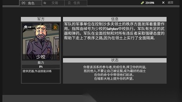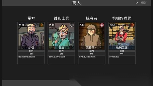 2. 可以看到有军方、维和士兵、掠夺者、机械修理师这四种商人