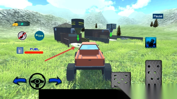 2、操控卡车(通过方向盘、踏板),在草地上行驶,躲避障碍,寻找“箭头”所指引的目标点。