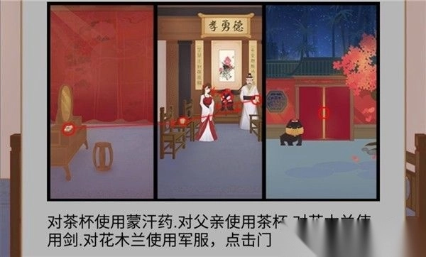 2、拿到爹爹的宝剑和盔甲给木兰,开门出去。