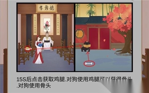 2. 前往后院,把鸡腿喂给狗狗,等狗狗吃完得到骨头后,将骨头放置在狗头上。