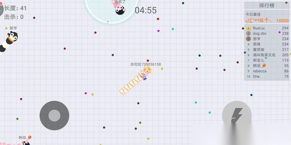1、控制摇杆走位你的小蛇,吃掉地图上彩色的小圆点,就会变长哦。
