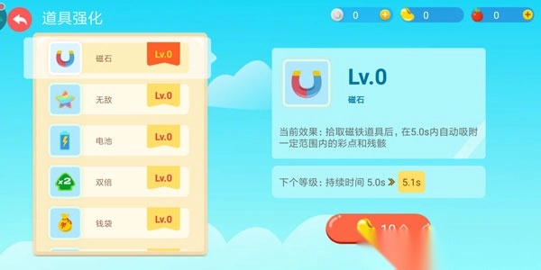 在挑战模式中,玩家在游戏中获得的金豆将用于道具的强化,而得分越高则最后结算时获得的金豆将越多。
