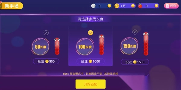 赏金模式的玩法是支付入场费进场,在支付入场费后选择参战长度并进行投注,长度和投注成正比。分别是50长度投注500、100长度投注1000、150长度投注1500。在赏金模式中,长度是固定不变的,使用加速技能不会对自身长度有消耗。