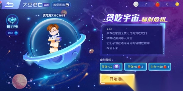 在太空逃亡中玩家可以体验一把在太空中进行游戏的感觉。在这种模式中,安全区域会逐渐缩小,活到最后是唯一的目标。一局游戏中共有29名玩家,安全区为绿色,辐射区则为红色。小蛇的头部在辐射区会受到持续伤害,要注意躲避辐射伤害进入安全区。