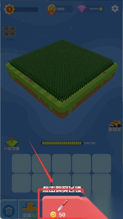 4、完成目标后进入商店,用金币升级武器威力、割草机速度及稻草单价,还可运用钻石购买稀有皮肤,让下一轮割草更有效率。