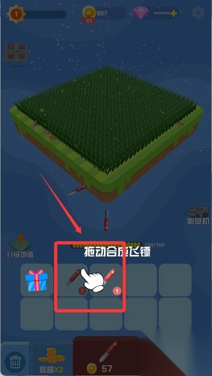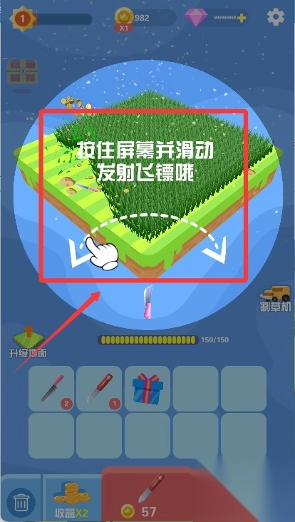 3、长按屏幕并滑动,即可发射飞镖进行割草。