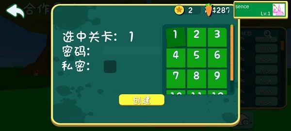 5、选择关卡,设定好密码,选择是否为私密房间,完成后点击创建