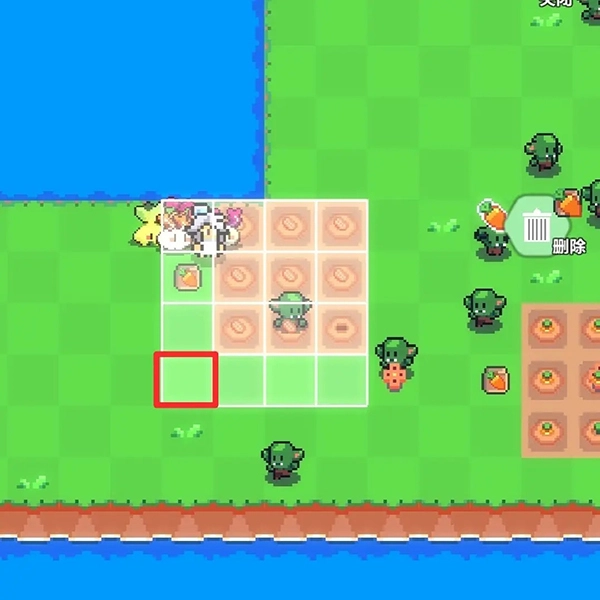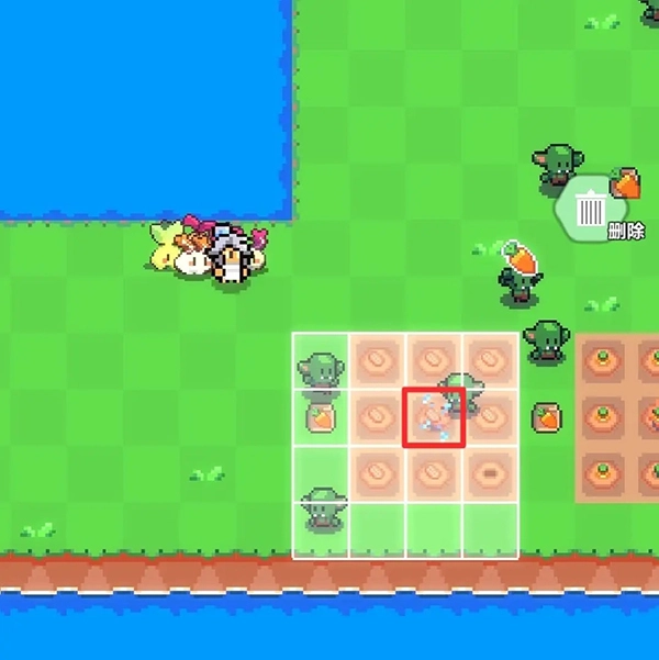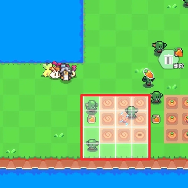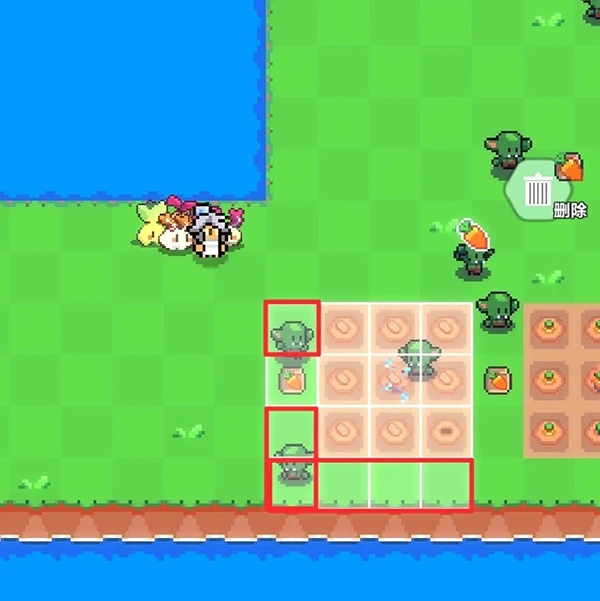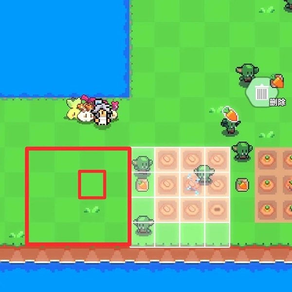 5、假定我们需把农作物挪动到图里的红色大方块区域,那么洒水器应当处于红色小方块区域。