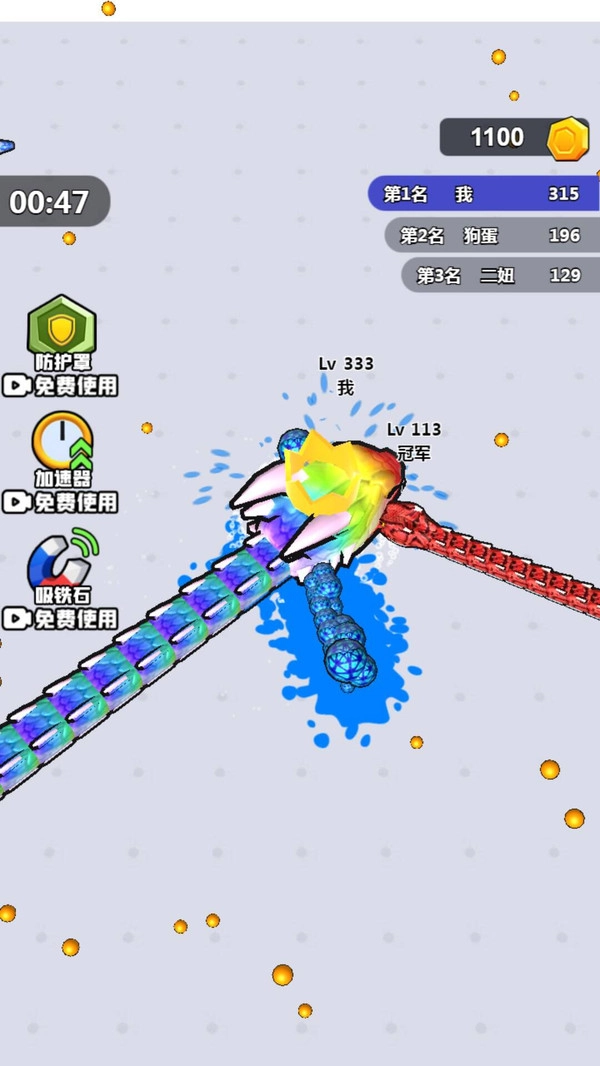 2. 主要玩法为多人在线对抗,玩家们在同一赛场展开竞技,借助吞噬食物以及围杀对手实现自身成长,最终角逐胜利。