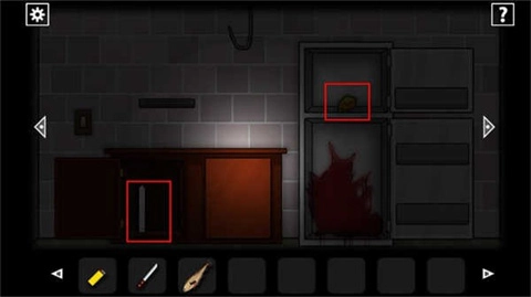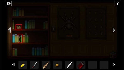 4、打开冰箱下一层,便能看到一个极其巨大的血印记。随后往右边走,径直来到摆放着蜘蛛标本的房间。点击书架第三层中间位置的书,即可进行查阅,从中能获取密码提示。
