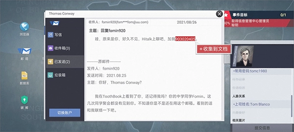 6、点开【邮箱】,登录目标对象的邮箱。在【已发送】邮件中查看,收集Hitalk账号【903020405】。于【收件箱】邮件里查看,收集部门负责人姓名【Tom Blanco】。