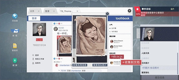 1. 在《无处遁形》游戏里,点开【浏览器】,搜索“TC191”。点击搜索结果中的Toothbook,按照提示收集目标的真实姓名【Thomas Conway】。