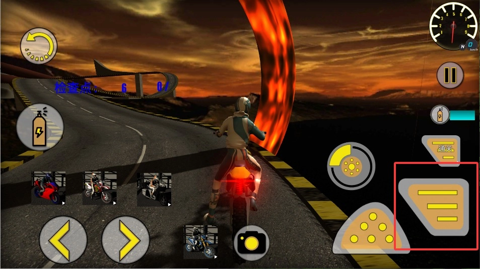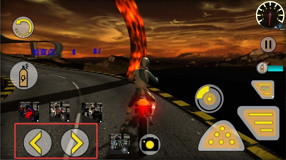 1、点击操控方向时,只需左键点击屏幕两侧即可调整摩托行进路线,注意及时避开赛道障碍物与竞争对手车辆。