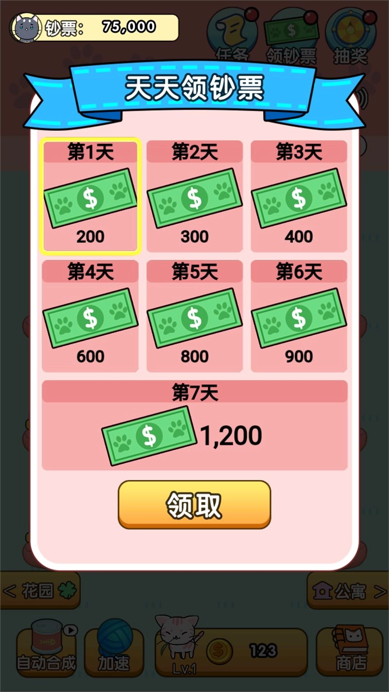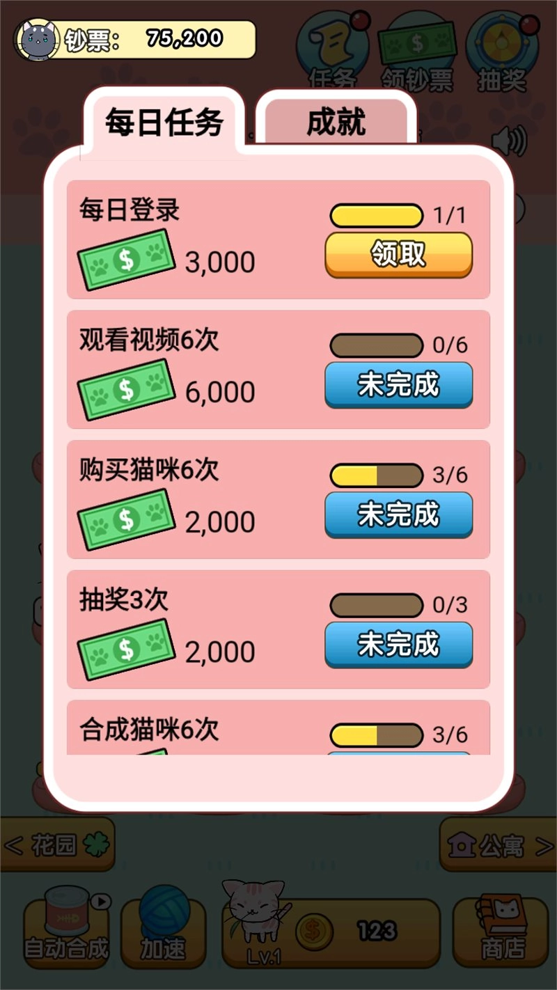1、体验有趣的养成和合成玩法,培养更多稀有品种的猫咪。