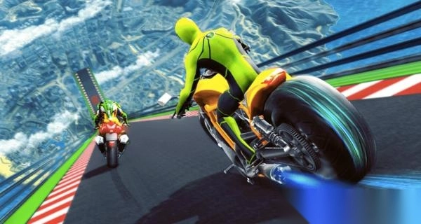 3、驾驭那辆黄色摩托,它尾部会有蓝焰加速效果。在高空赛道上始终保持高速行驶,借助加速技能奋力追赶前方的红色摩托,成功拉开与它的距离后,全力冲刺完成这场特技竞速。