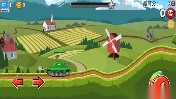 1. 在山地、田野等场景中操控坦克行驶,通过点击射击按钮对敌方坦克展开攻击,同时躲避障碍物持续前进。