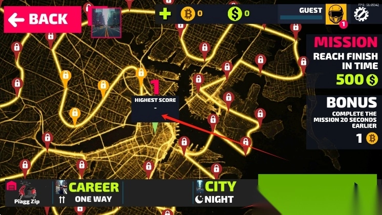 2、进入地图界面,解锁新任务点,查看任务要求,选摩托开启城市赛道挑战。