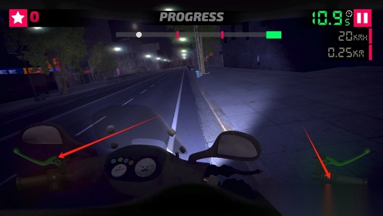3、比赛中操控摩托把手,控制方向与速度,在夜晚街道按时抵达终点完成任务。