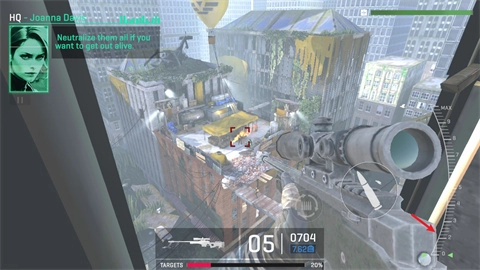 4、在某些场景下,还会切换至狙击枪。只需拖动右侧按钮,就能开启瞄准镜,并对距离进行调整。