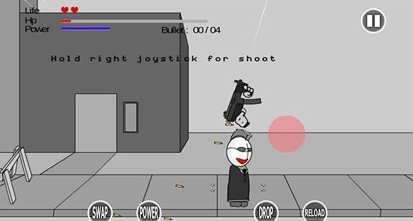 5、游戏开始时没有武器,需在击败敌人后拾取。屏幕右侧的红色圆圈,是用来操控机械手进行攻击的。