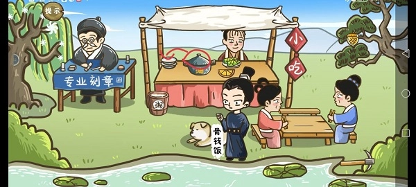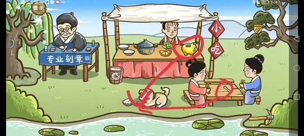 第三步:点击刻章的老头,待其说完话后,再次点击,会出现金色的章,接着将树上的松果拖拽到章上面。
