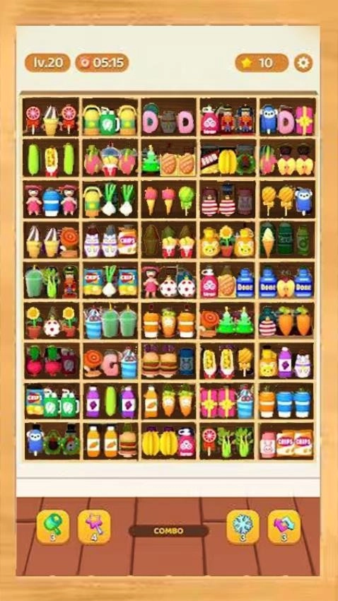 4、玩家可对不同货架上的相同物品进行拖动,实现二消或三消。与常规把物品置于有限格子中消除的方式不同,这里只需把相同物品放置到任意一个壁橱里就行。