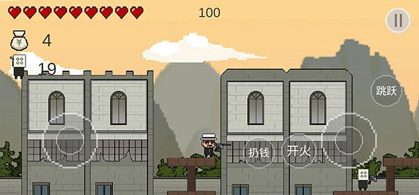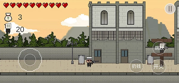 3、下面小编以单摇杆模式为例,点击进入游戏后,界面左下角是控制轮盘,右侧依次排列着跳跃、开火以及扔钱按钮,左上角则显示当前生命值、已获取的钱袋数量以及当前关卡中的敌人。