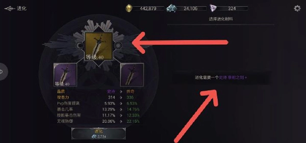 两把一模一样的史诗武器,进行武器升级操作,进阶至史诗+,武器的各项数值也会随之提升!