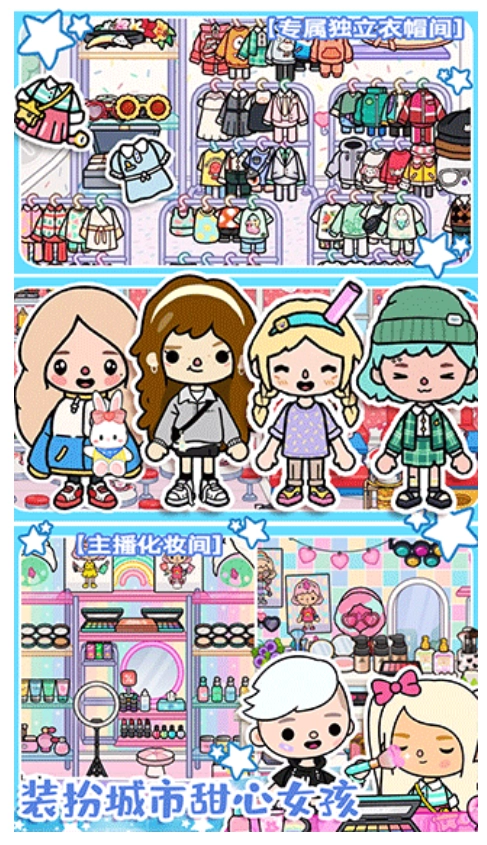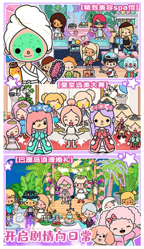 在托卡城市,你能随心选择:于大型医院体验担任主治医生的感觉;在婚礼教堂摇身一变成为优雅新娘;在樱花校园化身学霸校花或者麻辣教师;在广袤海洋化身为灵动的美人鱼;在公正的法庭上成为正义的使者;在选秀节目中崭露头角成为偶像明星,尽情享受这专属于你的独特身份!