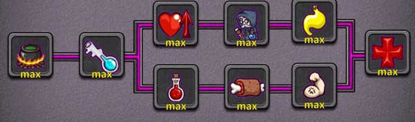 2. 具体效果为:开局获取的药水增多、开局解锁炼金师角色、HP数值增加、技能CD时间减少、开局的药水不存在负面效果、食物的回复量有所增加、40%的概率抵抗药水负面状态、击杀怪物有几率回复血量、在低血量情况下触发回血buff。