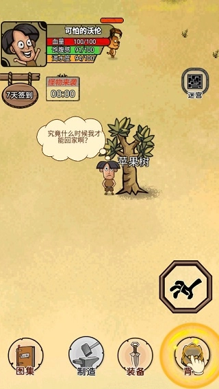 背包中包含持有物、食物以及道具。点击刚刚获取的苹果,接着点击“使用”,就能恢复少许饱腹感与喝水度。
