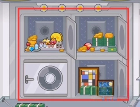 3、前往银行二楼,打开保险柜,按顺序把钻石、红心、星星以及贝壳放入其中,以此开启宝藏之门。
