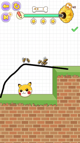 通关方式:画出一个呈梯形的圈,把狗狗圈入其中,如此一来蜜蜂便无法蛰到狗狗。