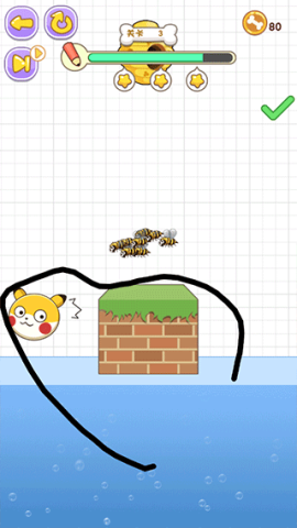 通关方式:绘制葫芦形状的线条,把狗狗围起来,并且要防止线条掉入水中。