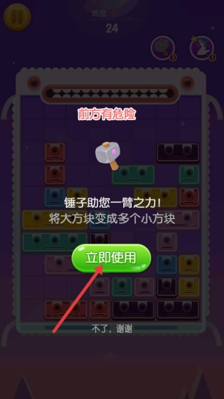 2、遇前方有危险提示,点击【立即使用】锤子道具,拆分大方块助力消除。