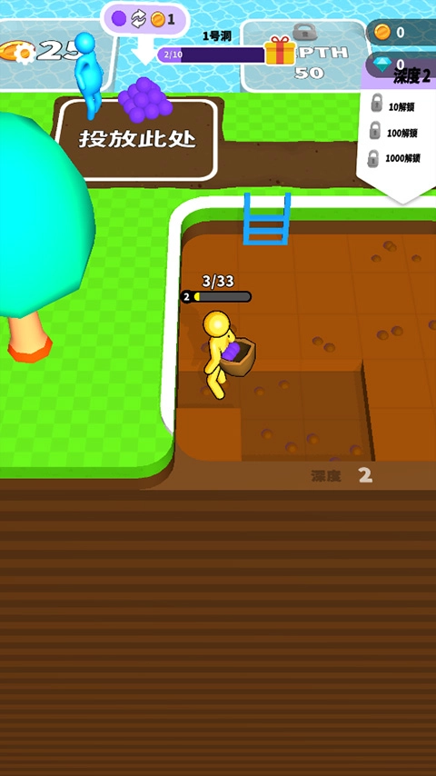 《看谁挖得深》是一款以挖掘为主题的手机休闲解压小游戏,融合了动作、角色扮演和模拟经营元素,英文名为Dig Deep ,这里呈现的是它的中文版本。游戏伊始,玩家要亲自扮演一名掘地者,在挖掘地面提升等级的同时,收集地下的矿藏,通过兑换金币来雇佣员工,从而让自己摆脱重复劳动,开启新的矿厂致富之路。从挖掘土壤、收集矿藏,到兑换金币、雇佣员工,游戏里的每个环节,都得由玩家操控角色亲自完成。